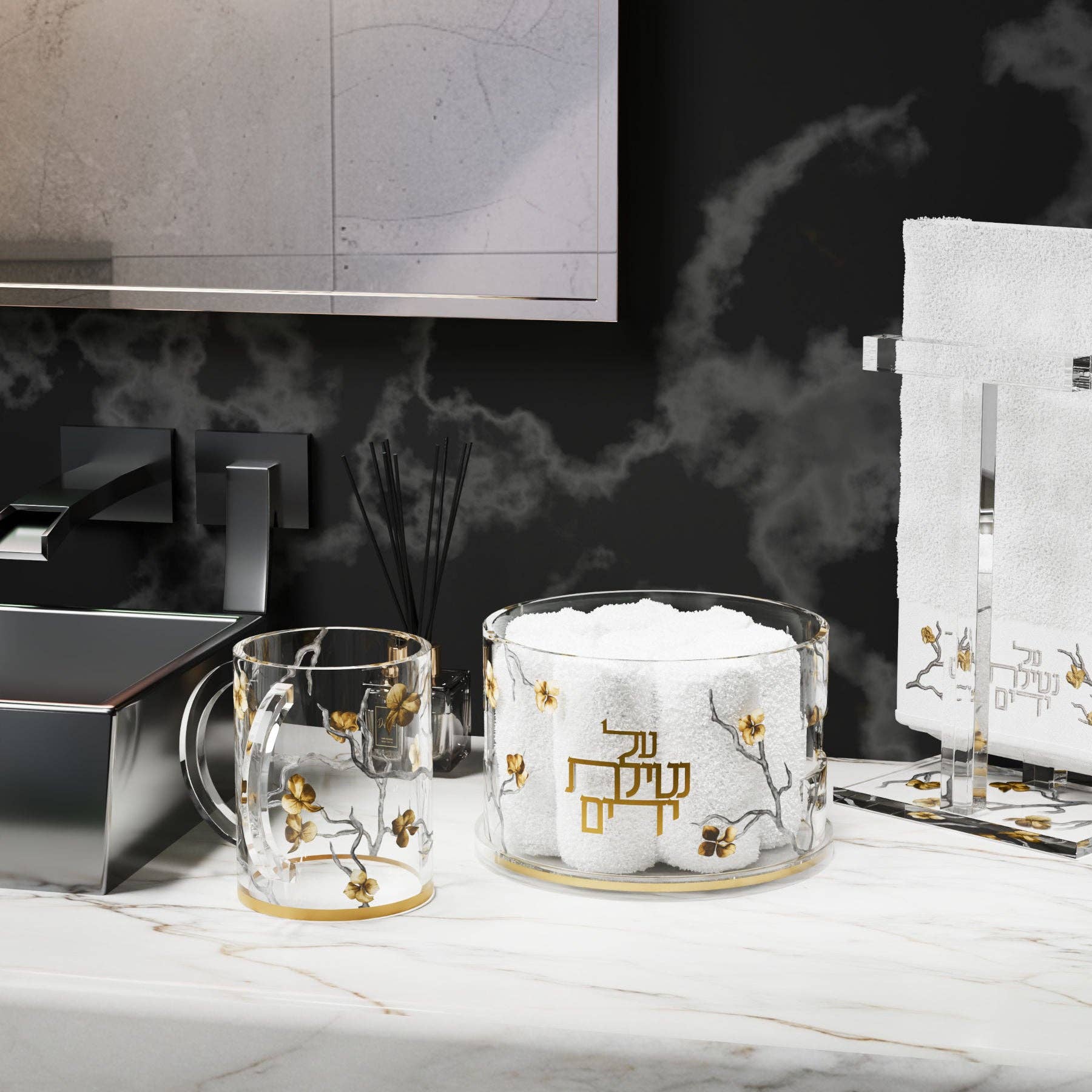 The Golden Branch Towel Box, with it's luxurious design featuring a unique golden branch design and raised 3D title and border, embodies both beauty and functionality, adding sophistication to any interior. Each box includes 8 plush towels for a luxurious touch and is available in both Hebrew and English editions it is perfect for displaying in any space or gifting to a loved one.