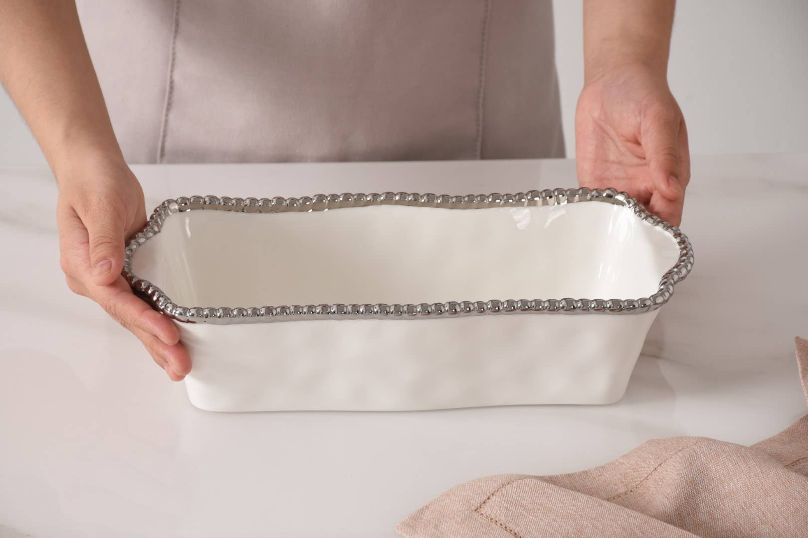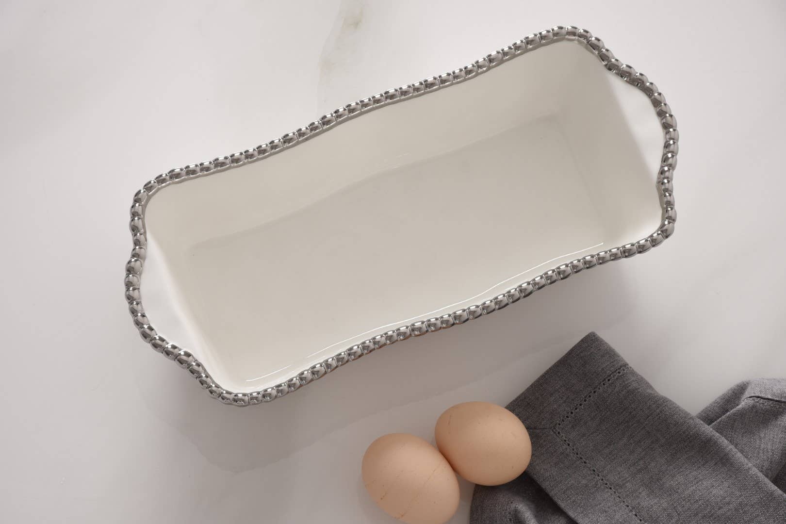 Gleaming white porcelain with lustrous silver beads in titanium.