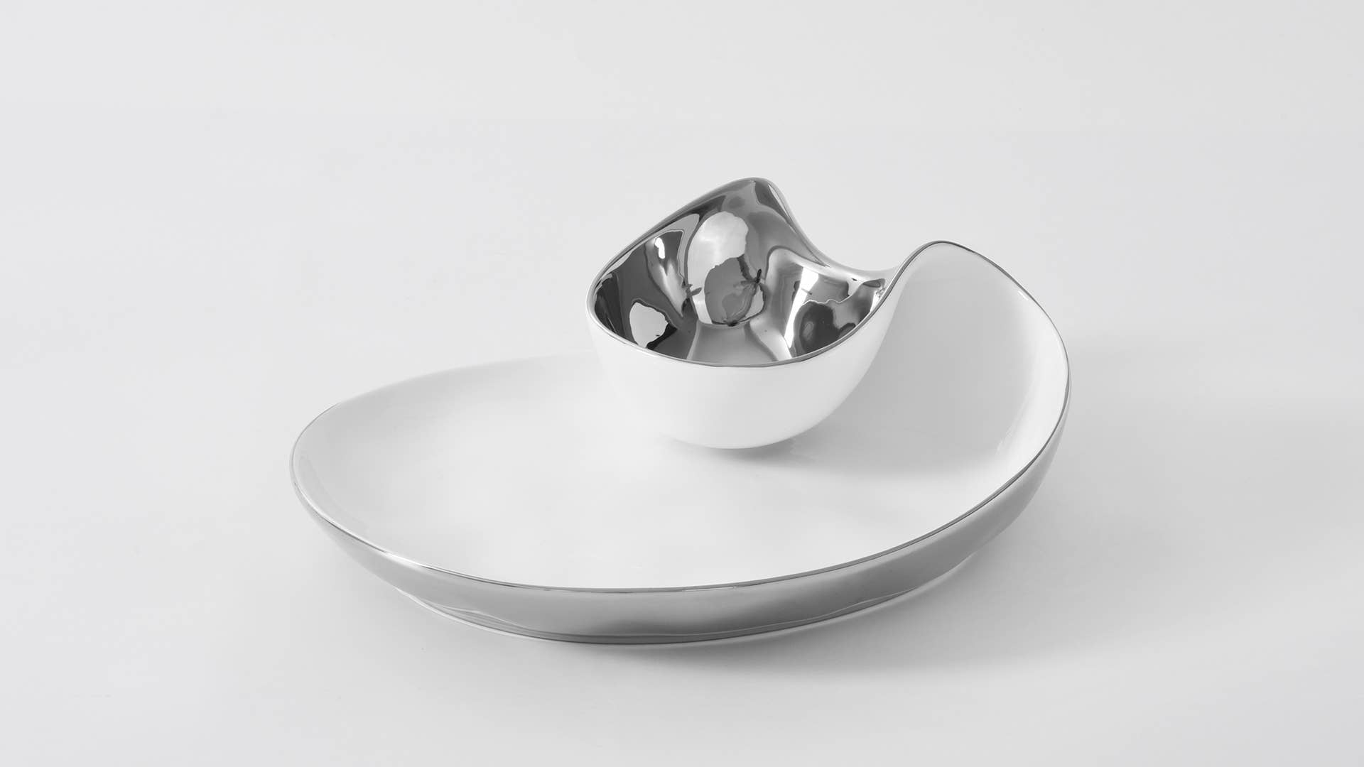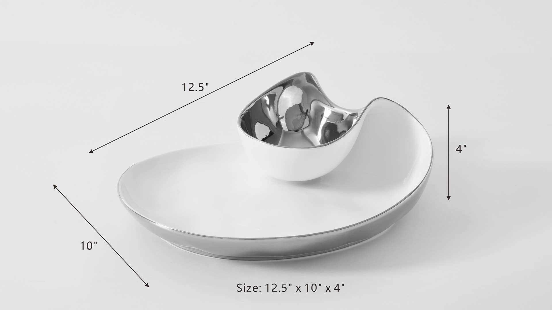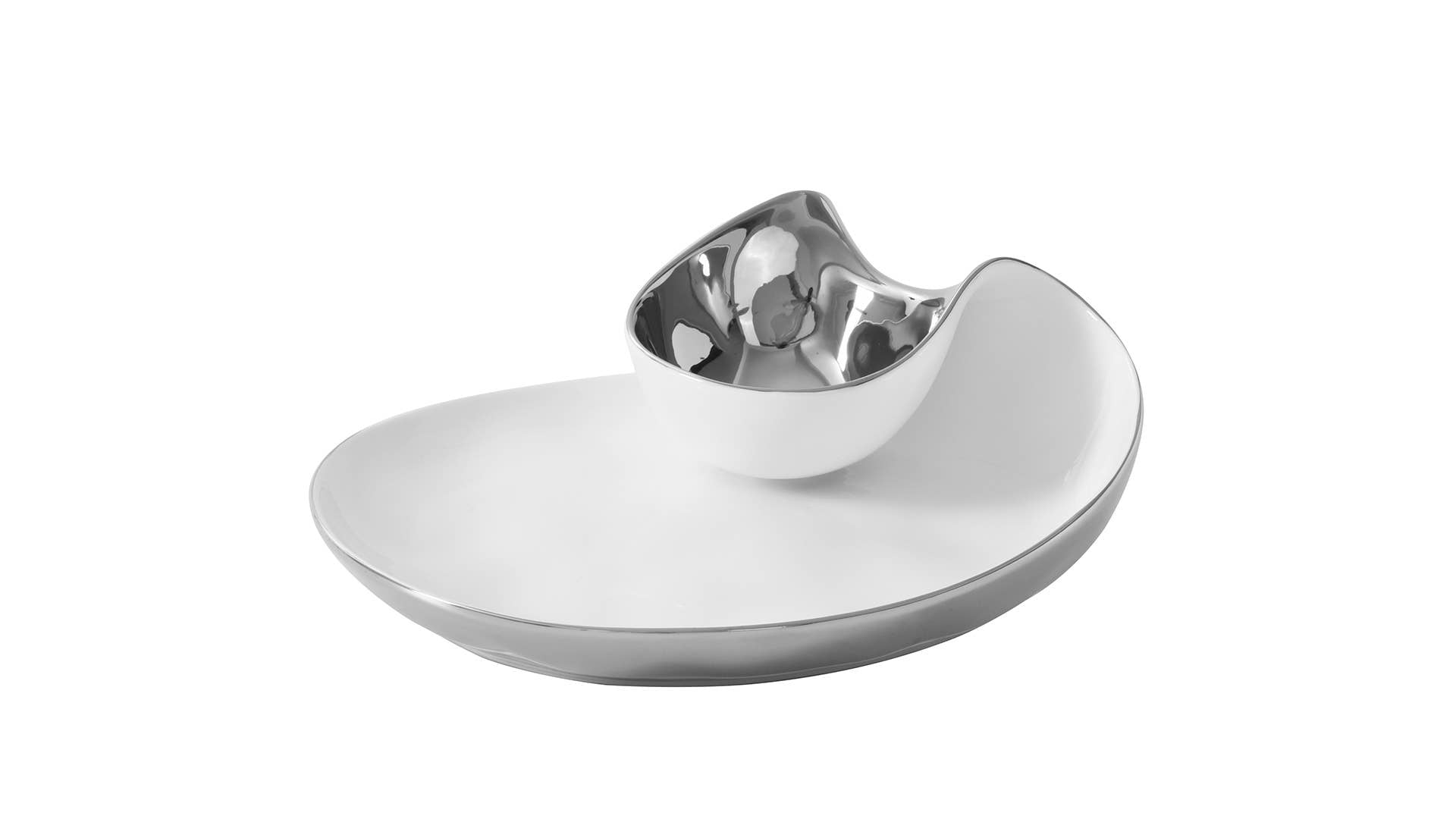 Perfect for any dip combo: hummus and pita, salsa and tortilla chips, veggies and ranch or our favorite berries and whipped cream! This piece also makes a stunning display for sushi and soy sauce or crab cakes and tartar sauce. Crafted in a luxurious white high-fired porcelain and dazzling silver titanium.