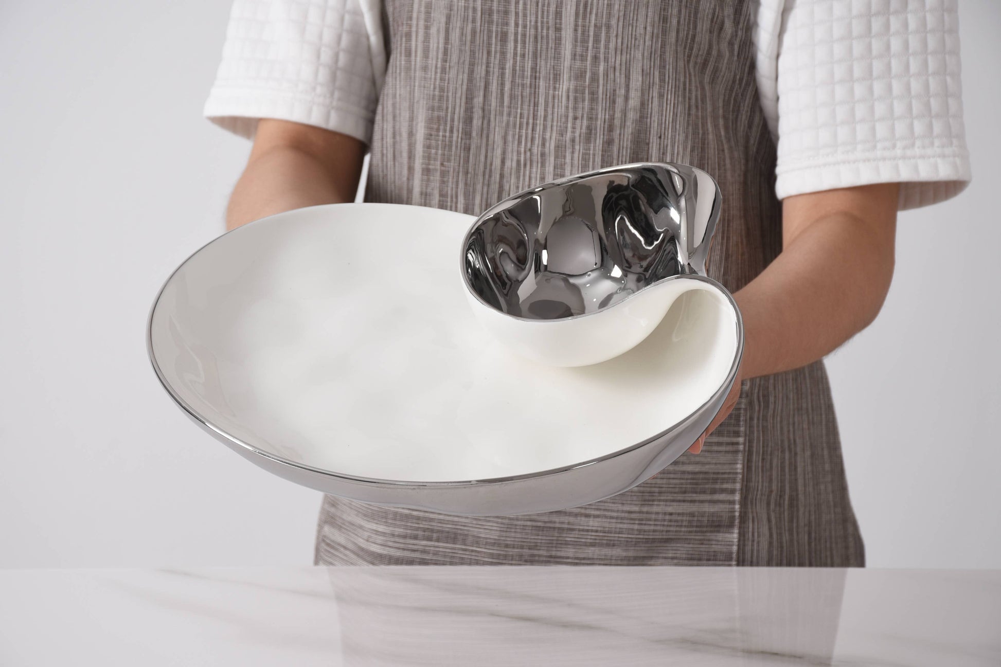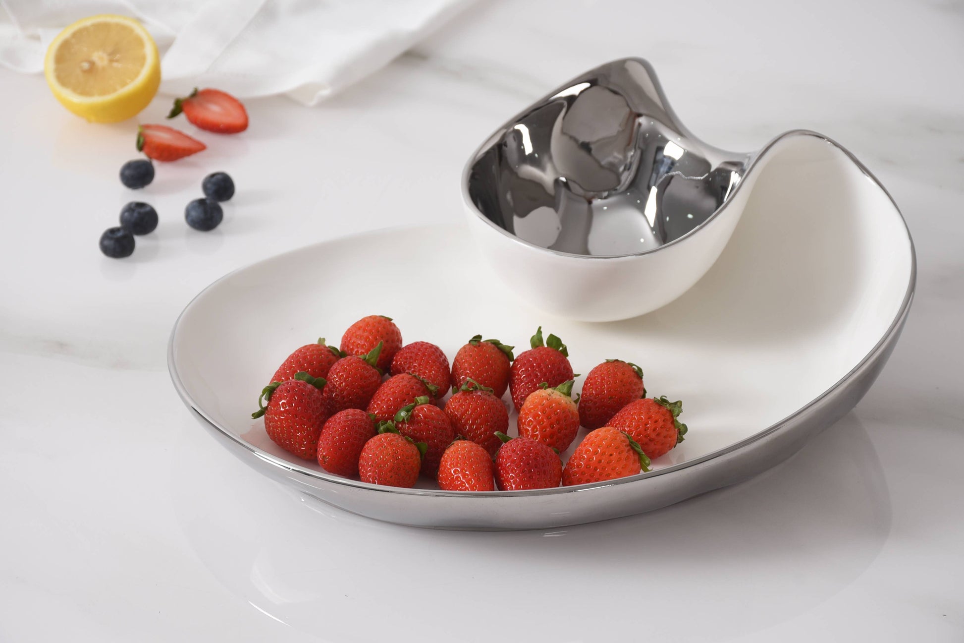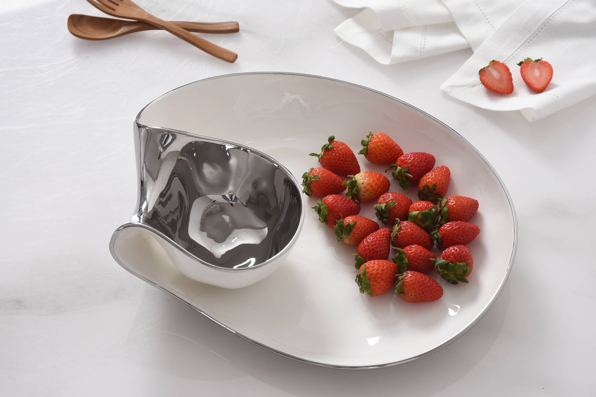 Perfect for any dip combo: hummus and pita, salsa and tortilla chips, veggies and ranch or our favorite berries and whipped cream! This piece also makes a stunning display for sushi and soy sauce or crab cakes and tartar sauce. Crafted in a luxurious white high-fired porcelain and dazzling silver titanium.
