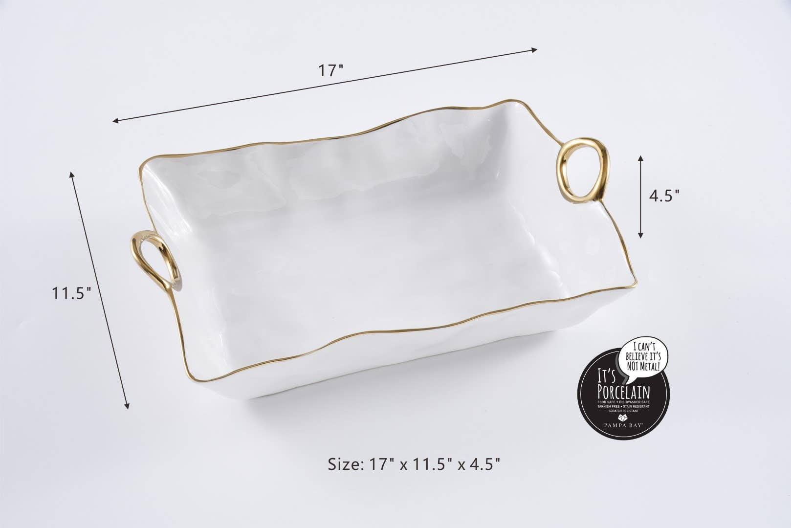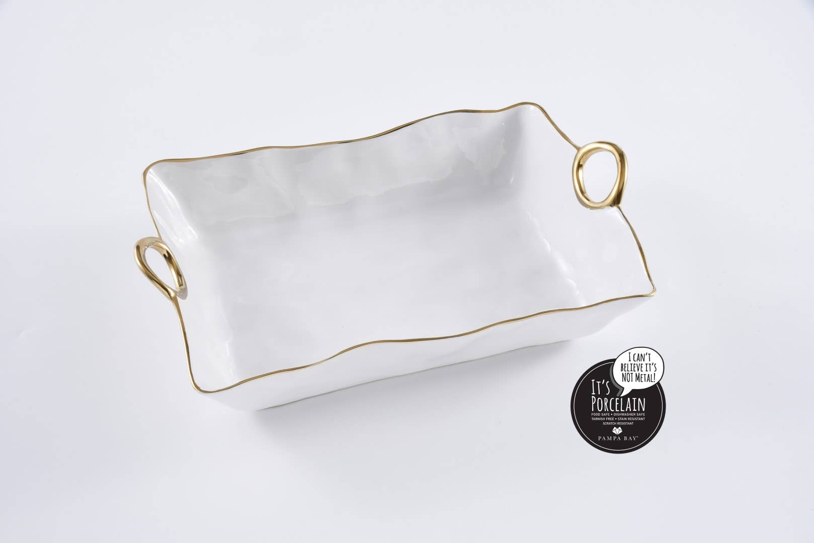 Stunning white porcelain with smooth and graceful handles in gold titanium. Food safe. Dishwasher safe. Cook right in the server or reheat with no worries.