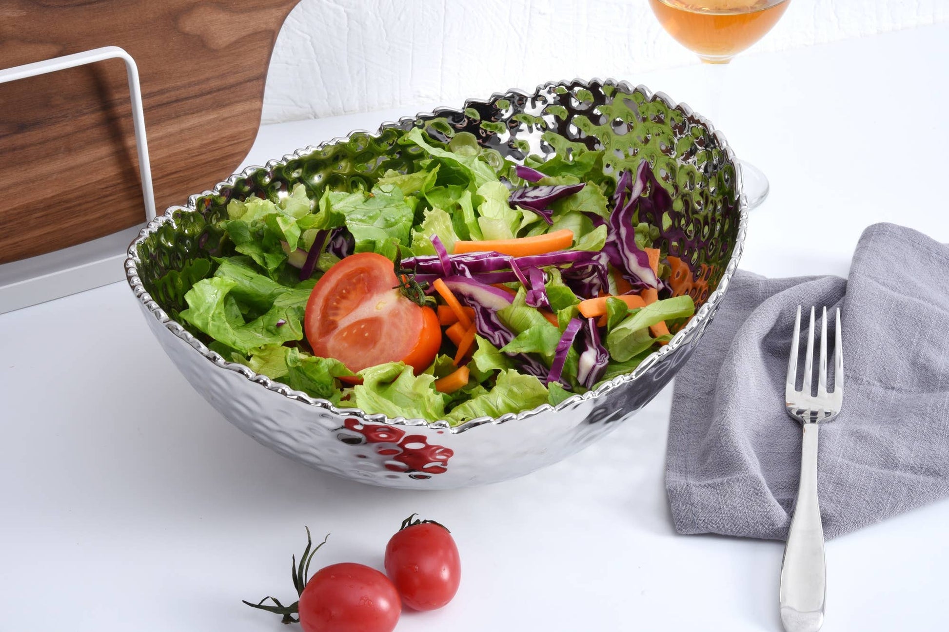 Perfect for serving a delicious garden salad, roasted potatoes and vegetables or fruit. Lustrous silver tone titanium finished high-fired porcelain.