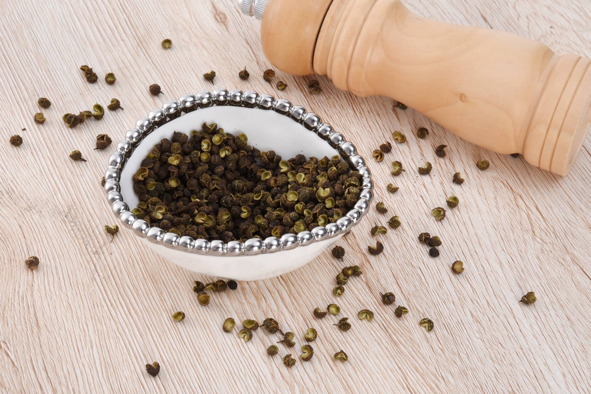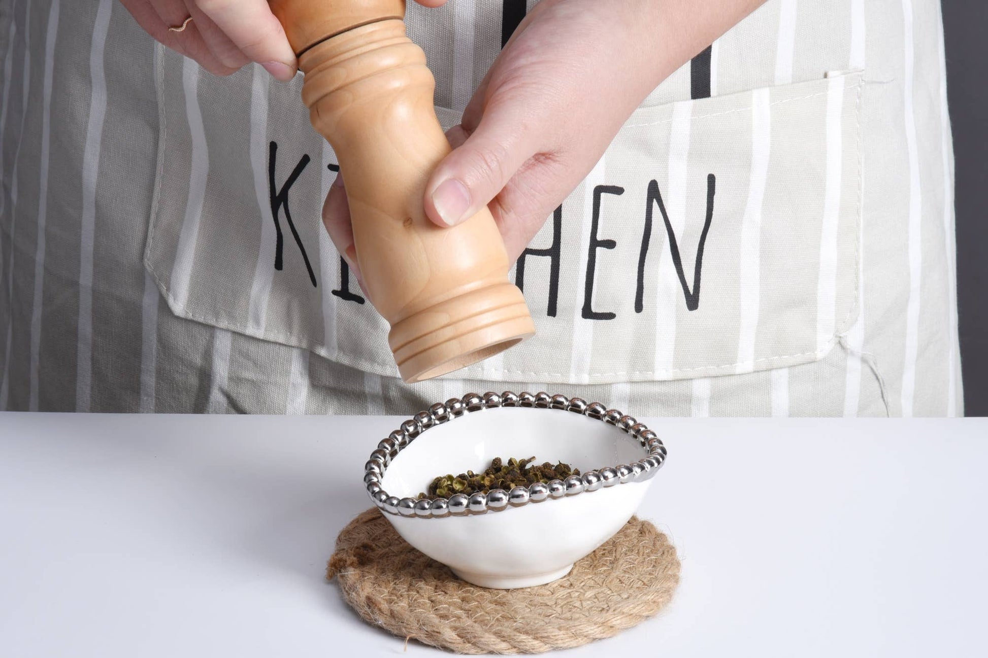 Gleaming white high-fired porcelain with titanium finished silver beading.