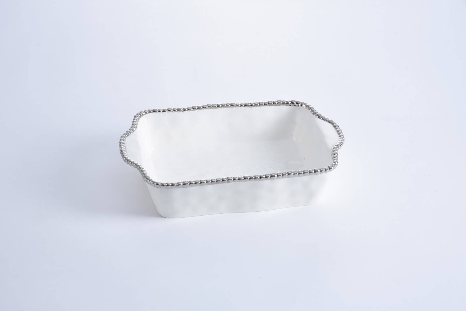 Gleaming white porcelain with lustrous silver beads in titanium.