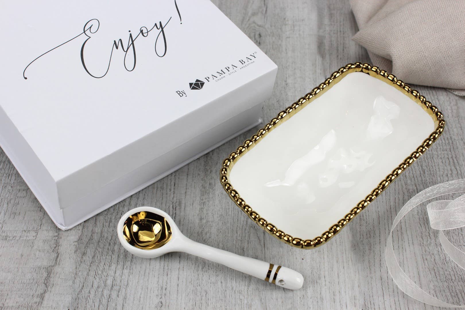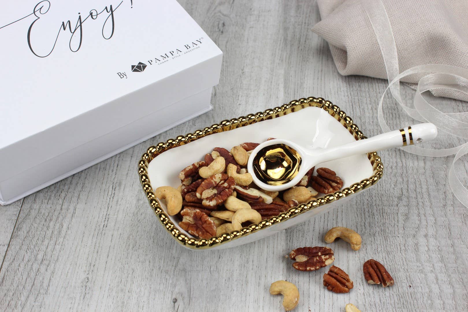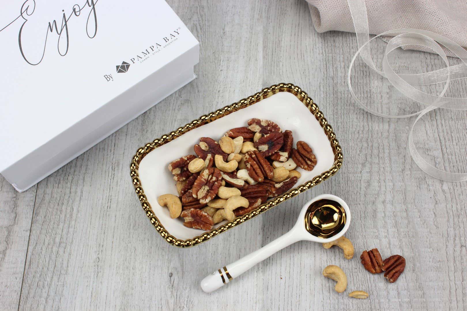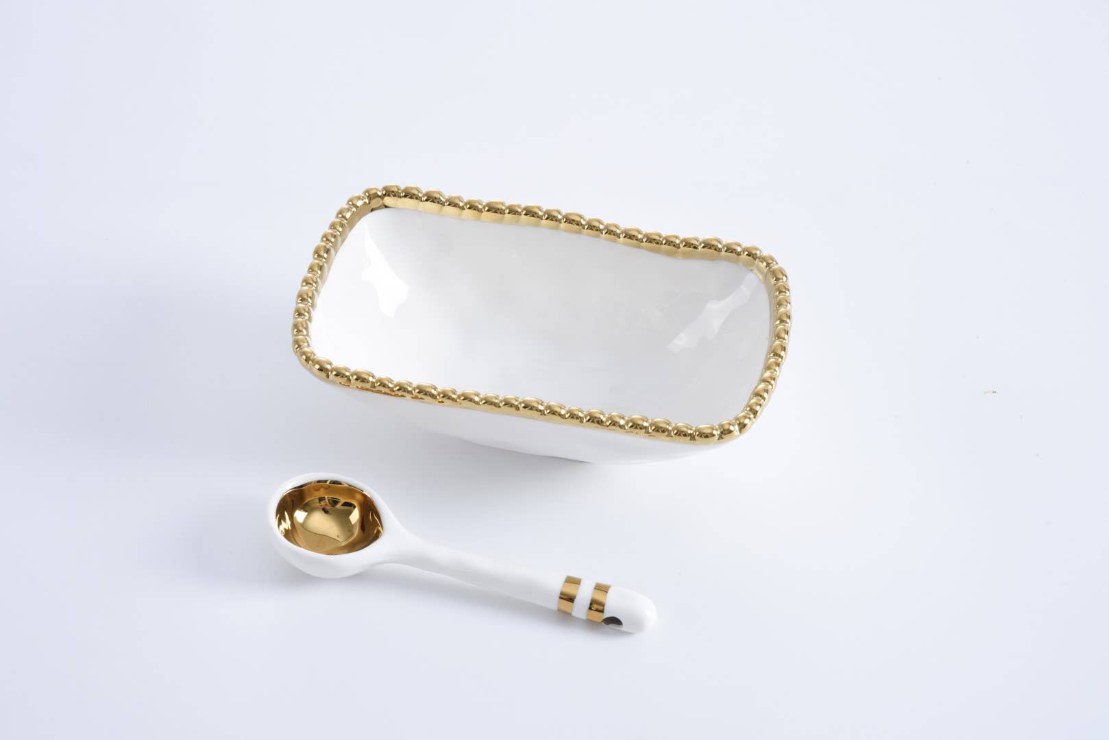 Beautifully packaged in a gift box with a fun sentiment on the inside cover that can be personalized. Great for serving candies, nuts, fruit or condiments! Both bowl and spoon made of gorgeous white porcelain with gold beaded trim and accents.