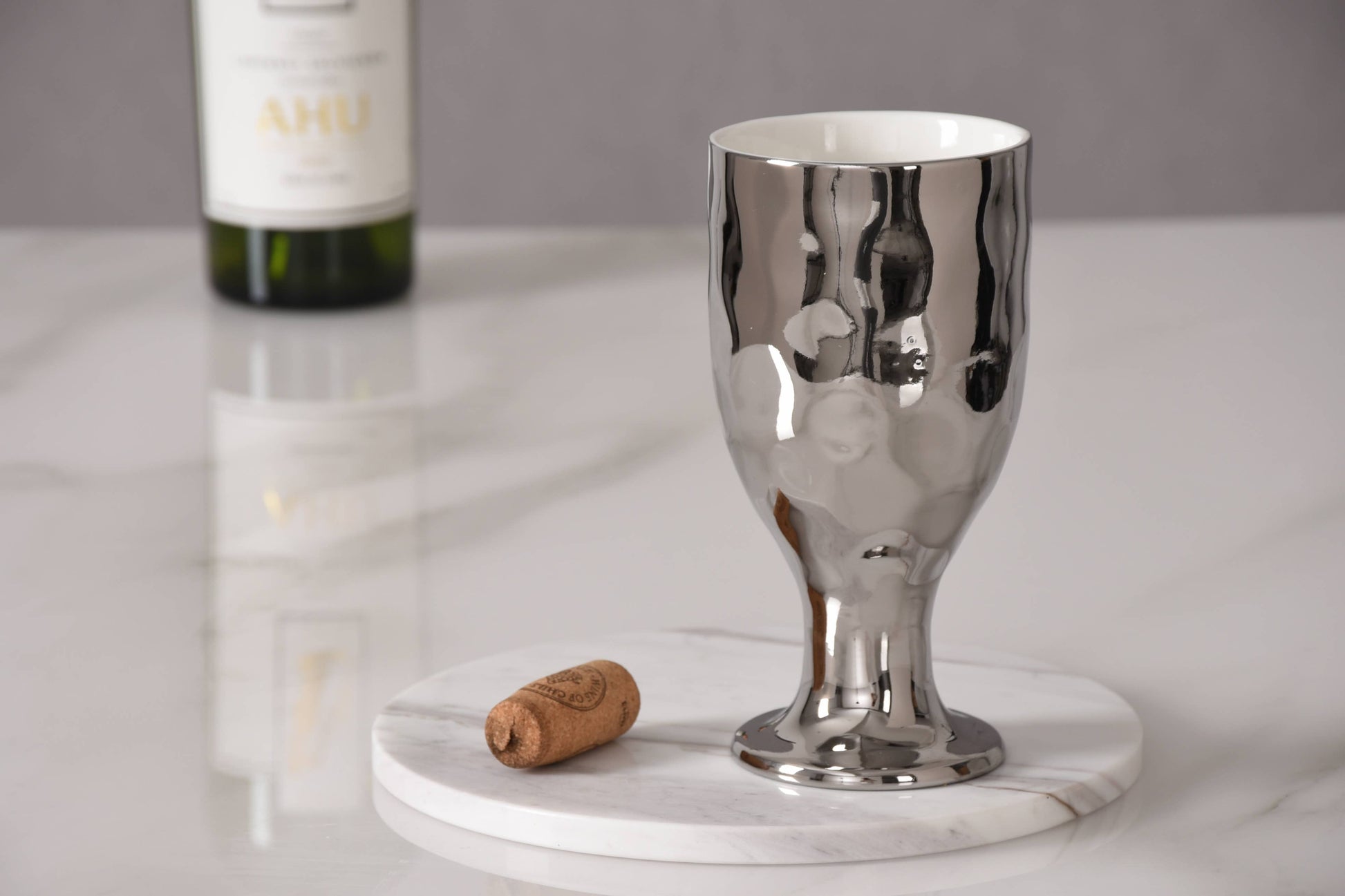 The perfect additions to your home bar or can be gifted to the wine enthusiast who loves to entertain. Handcrafted in striking high-fired white porcelain combine with an elegant metallic silver finished outside.