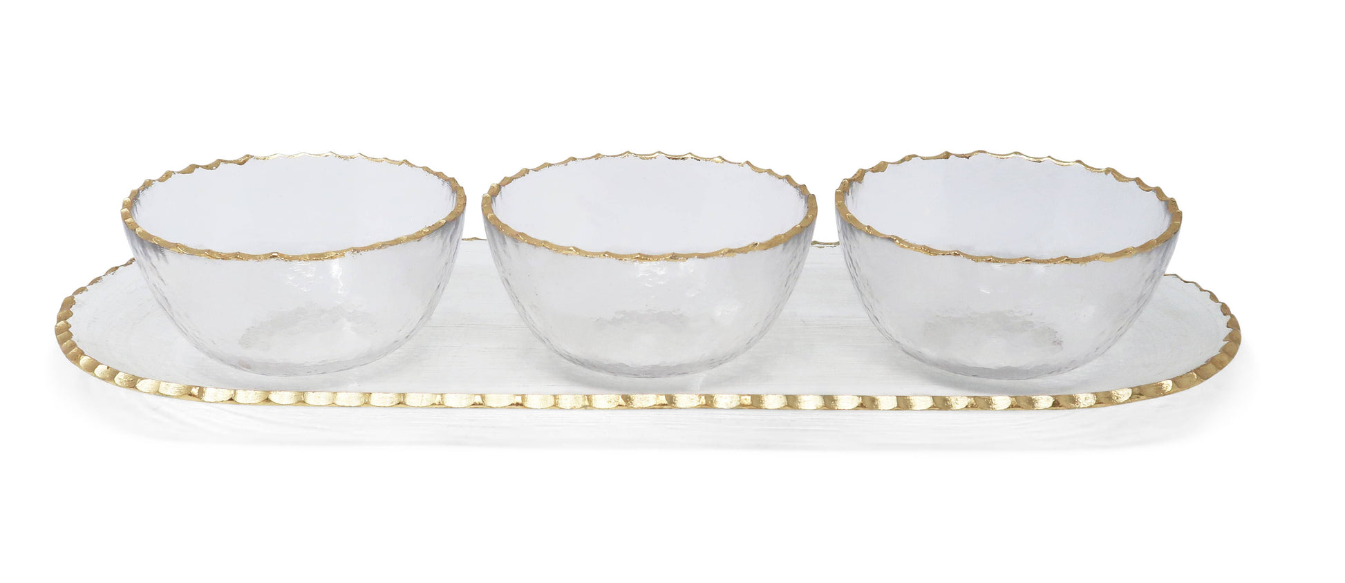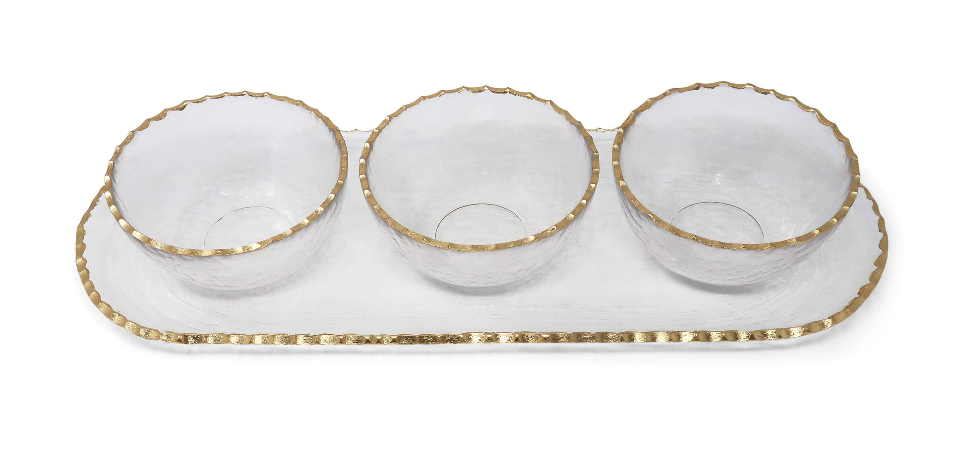 Experience entertaining with style with this 3 Bowl Serving Dish on Tray with Gold Rim. Featuring glass construction with a gold rim, this serving dish will add a touch of luxury to your next gathering. Perfect for entertaining with friends or family, this serving dish offers an aesthetic upgrade with its modern and stylish design.