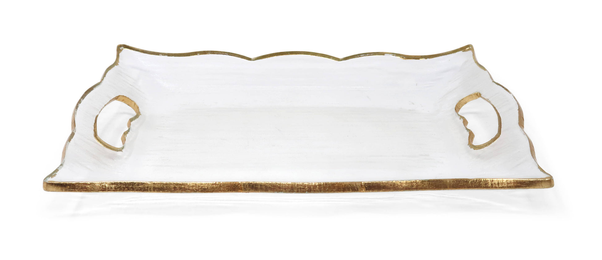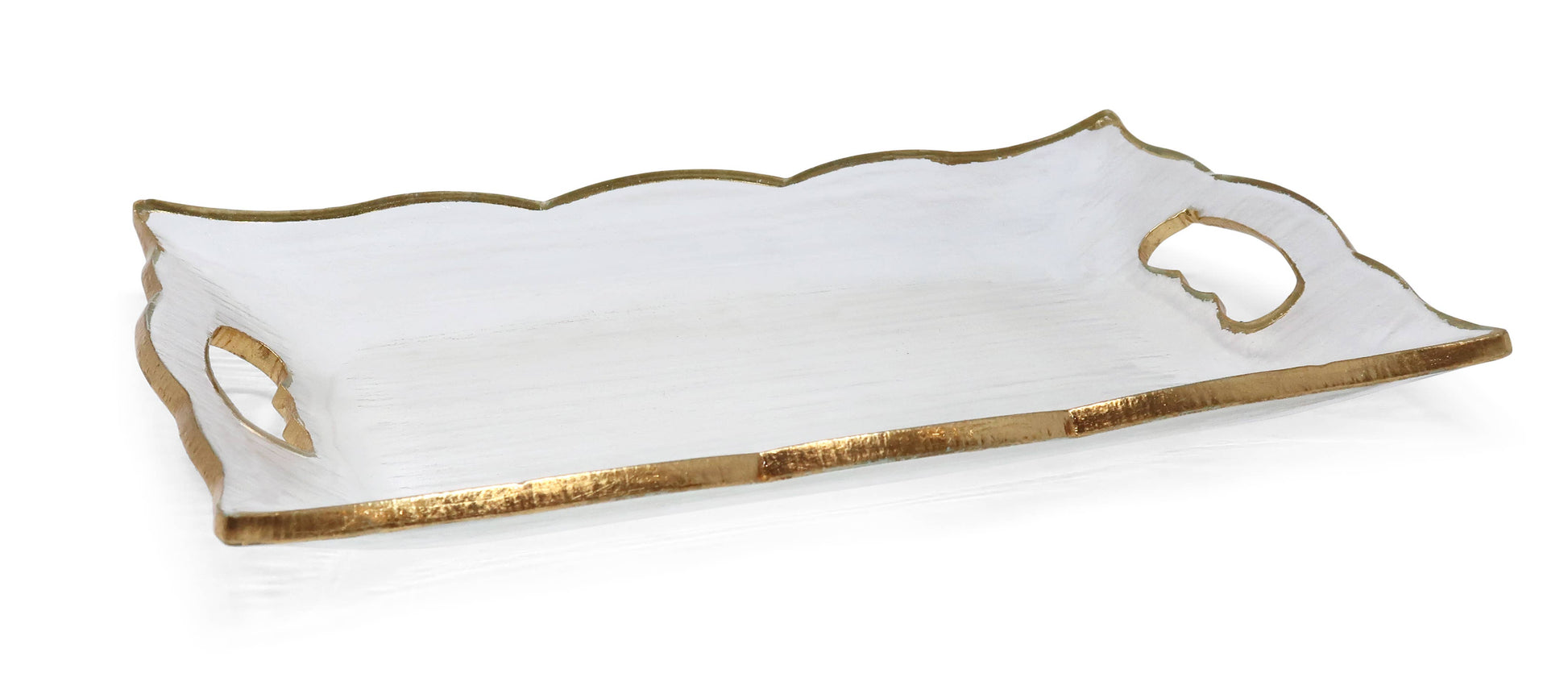 This functional and stylish rectangular glass tray has a gold scalloped rim and handles, making it perfect for serving snacks, meals, and drinks. Its durable construction ensures its lasting wear and tear, while its modern design adds a timeless flair to any home.